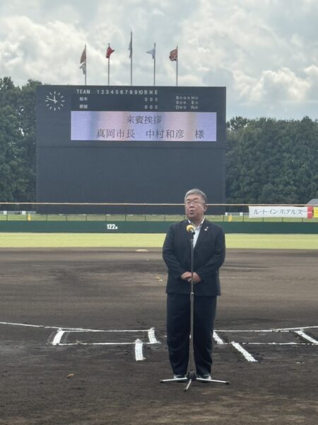 試合前には、地元の市長として歓迎のご挨拶をさせていただきました。