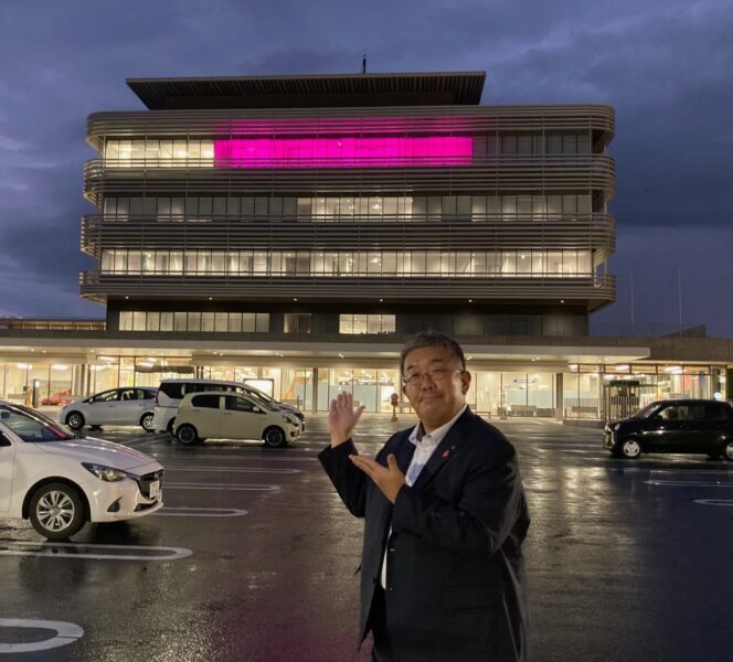ちなみに、市役所のライトアップは、9月23日(火)の「手話言語の国際デー」に合わせて、9月19日(金)~23日(火)の期間、青色にライトアップしたのに続いて今回が2回目となります。