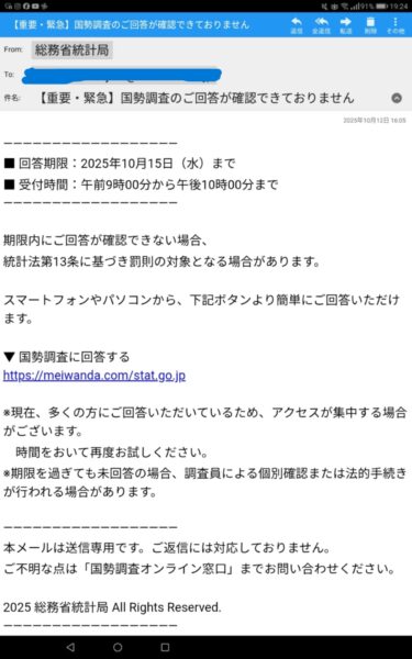 国勢調査に絡んで、不審なメールが送付される事案が非常に多く発生しているようです(添付した画像は、真岡市内にお住まいの方に届いたもの)。