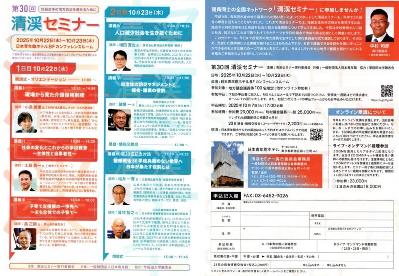 この「清渓セミナー」は、各地の議員有志が実行委員として運営しているのが特徴でして、今回から私が実行委員長を務めています。